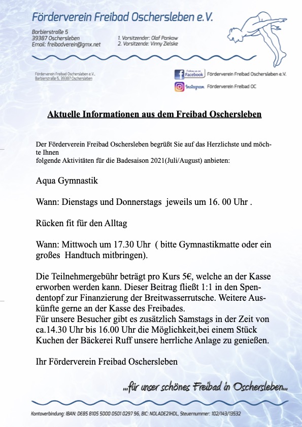 Liebe Gäste des Freibades Oschersleben, der Förderverein Freibad Oschersleben begrüßt Sie auf das Herzlichste. Freuen wir uns auf eine hoffentlich unbeschwerte und schöne Badesaison 2021. Dieses Jahr steht ganz im Zeichen unserer großen Spendenaktion zur Erhöhung der Attraktivität unseres Freibades,eine Breitwasserrutsche für das Nichtschwimmerbecken zu organisieren. Es ist ein sehr anspruchsvolles Ziel und wir sind für jede Unterstützung dankbar. Hierzu haben wir folgende Aktivitäten vorbereitet: Dienstags und Donnerstags können Sie um 16. 00 Uhr an der Aquagymnastik teilnehmen. Mittwochs startet um 17.30 Uhr ein Rückenfit- Programm ( bitte Gymnastikmatte oder ein großes Handtuch mitbringen). Die Teilnehmergebühr beträgt pro Kurs 5€, welche an der Kasse erworben werden kann. Dieser Beitrag fließt 1:1 in den Spendentopf zur Finanzierung der Breitwasserrutsche. Weitere Auskünfte Read more